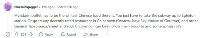 想不到,在本地论坛Reddit上的多伦多板块(/askTO)居然会有人问:“我的男朋友想吃‘白人中餐’,有什么建议嘛?”