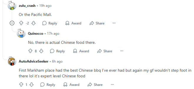 还有网友居然提到了太古(Pacific Mall),直接被踩到-2赞。像First Markham Place和太古这样的地方,都是正宗的中餐。用网友的话来说:“这是专家级中餐(it’s expert level Chinese food)。”