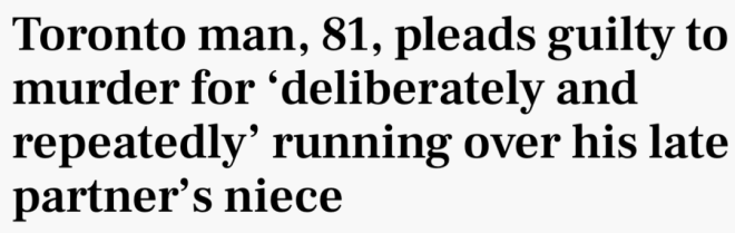 谁能想到,一位81岁的竟然会做出如此丧心病狂的事?多伦多近日发生了一起骇人听闻的谋杀案,一名八旬老汉因未被列入同居妻子的遗嘱,竟驾车疯狂碾压妻子的外甥女,导致其当场惨死!