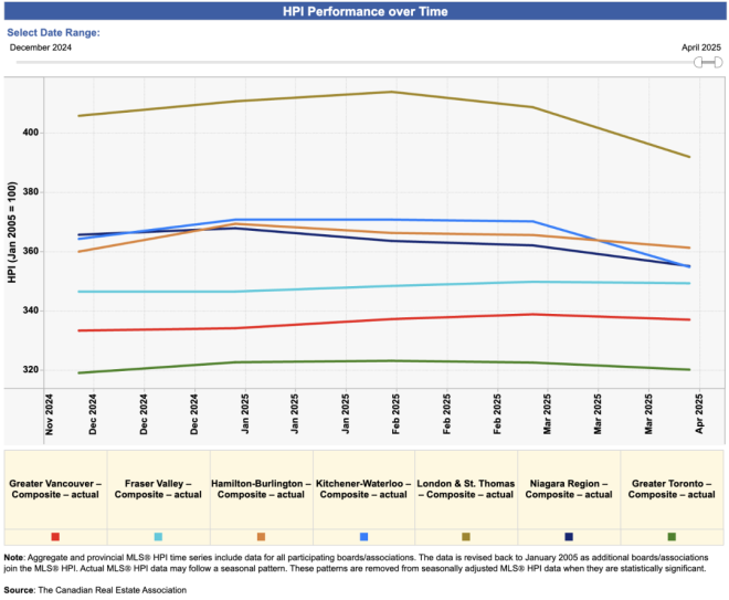 多伦多在5个月内下跌了6.2%,而被视为大多外围通勤圈的几个区域跌得更惨,分别是:伦敦市(London)下跌7.7%,基奇纳-滑铁卢地区(Kitchener-Waterloo)下跌7.6%,尼亚加拉地区(Niagara)下跌6.9%,汉密尔顿(Hamilton)下跌6.5%。与此同时,大温地区和菲莎河谷也在4个月内下跌了2.8%。