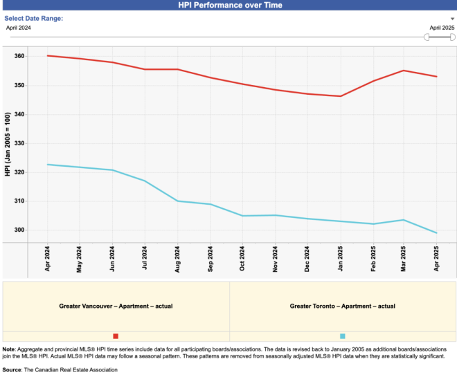 其中,公寓跌得最惨,多伦多的公寓MLS房价指数年均下跌7.3%,温哥华则下跌2%。