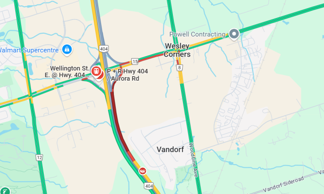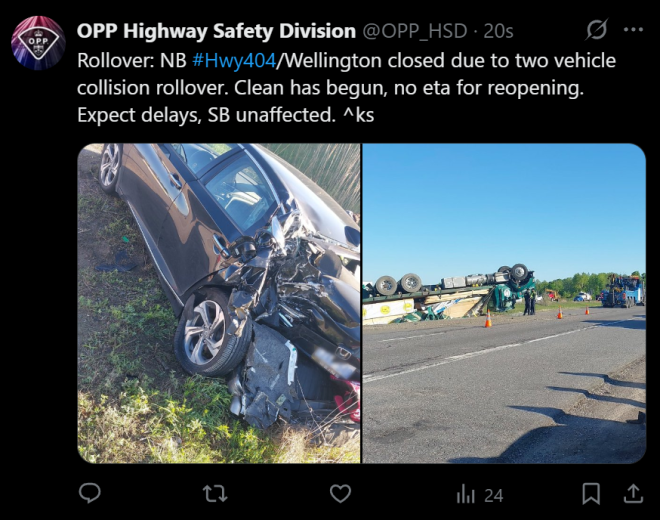 OPP发布消息说:Hwy404/Wellington 因两辆车相撞翻覆而关闭。清理工作已开始,尚无预计重新开放时间。预计会有延误,南行路段不受影响。
