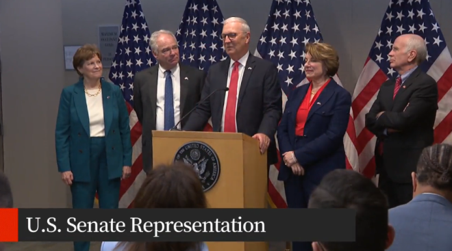 同行的还有来自新罕布什尔州的民主党参议员Jeanne Shaheen、明尼苏达州的Amy Klobuchar和佛蒙特州的Peter Welch。他们与Kaine和Cramer一同访问,还会见了加拿大外交部长、国防部长、工业部长以及加拿大商业委员会代表。