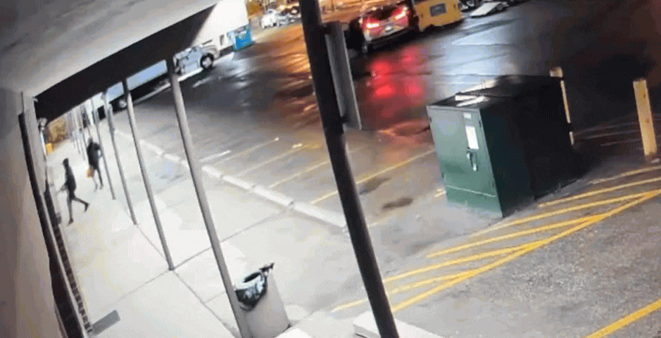 一人似乎拿着一个罐子,另一人则拿着一根疑似金属棒的东西。两人砸碎了餐厅的前窗,然后走了进去。片刻之后,他们再次出现,其中一人回到停车场的一辆车旁,另一人点燃了一个物体并将其扔进屋里。第二人跑回车里,随后逃离了广场,现场火光四起,浓烟滚滚。
