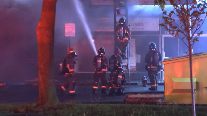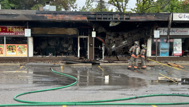 多伦多消防局(TFS)表示,发生在周六清晨3点36分左右,地点在位于1198号Kennedy Road的一个小型商场内,靠近Lawrence Avenue East。是一名路过的司机发现起火并报警。