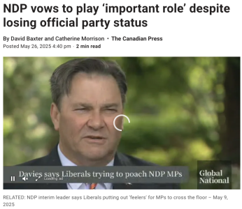 新民主黨臨時黨領唐·戴維斯(Don Davies)告訴加拿大新聞社,他已經與總理辦公室就讓新民主黨在下議院獲得官方政黨地位的問題進行了溝通。