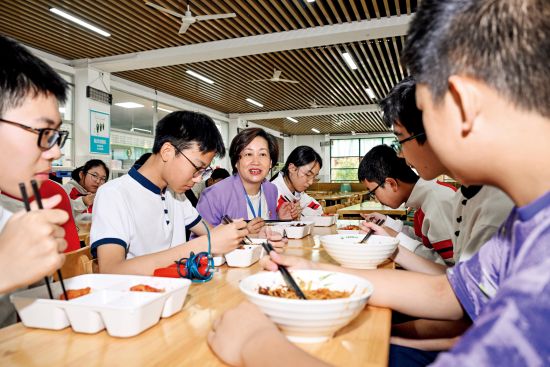 2025年4月27日,安徽合肥市庐阳区寿春中学食堂,学校领导陪同学生用餐,倾听学生饮食需求。图/视觉中国
