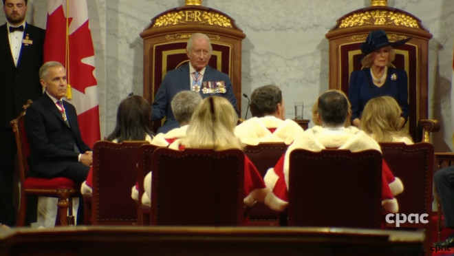 周二,查尔斯三世国王与卡米拉王后在渥太华市中心参加仪仗巡游后,正式步入参议院。国王随后发表施政演说(Speech from the Throne),阐述总理马克·卡尼(Mark Carney)对新一届国会会议的施政目标与愿景。