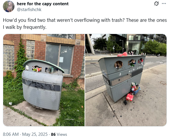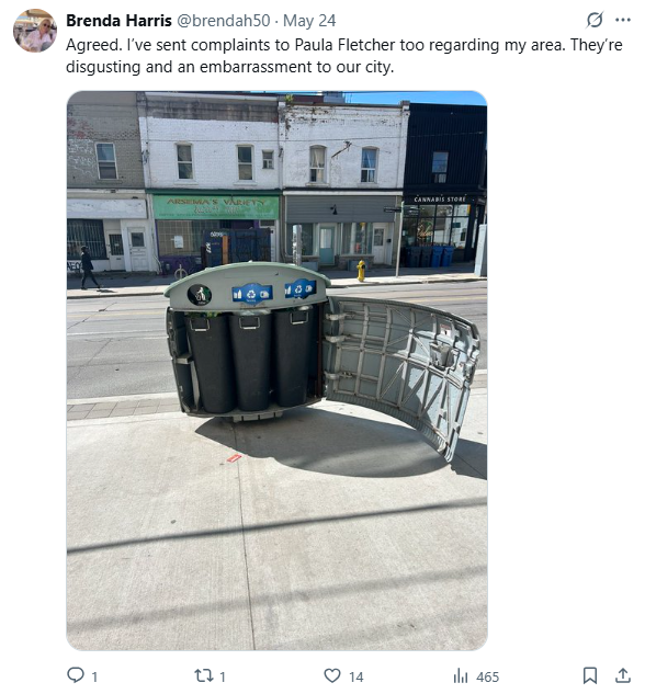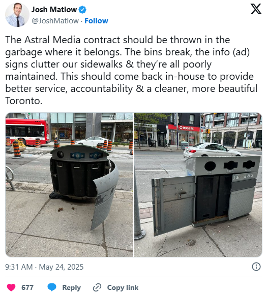 最近,多伦多市议员乔什·马特洛(Josh Matlow)在社交媒体上批评了市与Astral Media签订的垃圾收集和维护合同。该合同规定,市政府负责垃圾收集,Astral Media负责维护垃圾桶。