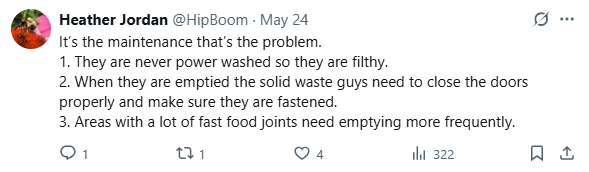 另一位网友说道:“问题在于维护,这些垃圾桶从来没人用高压水枪冲洗,所以很脏。清空垃圾桶时,垃圾处理人员需要关好门,并确保它们已锁好。”