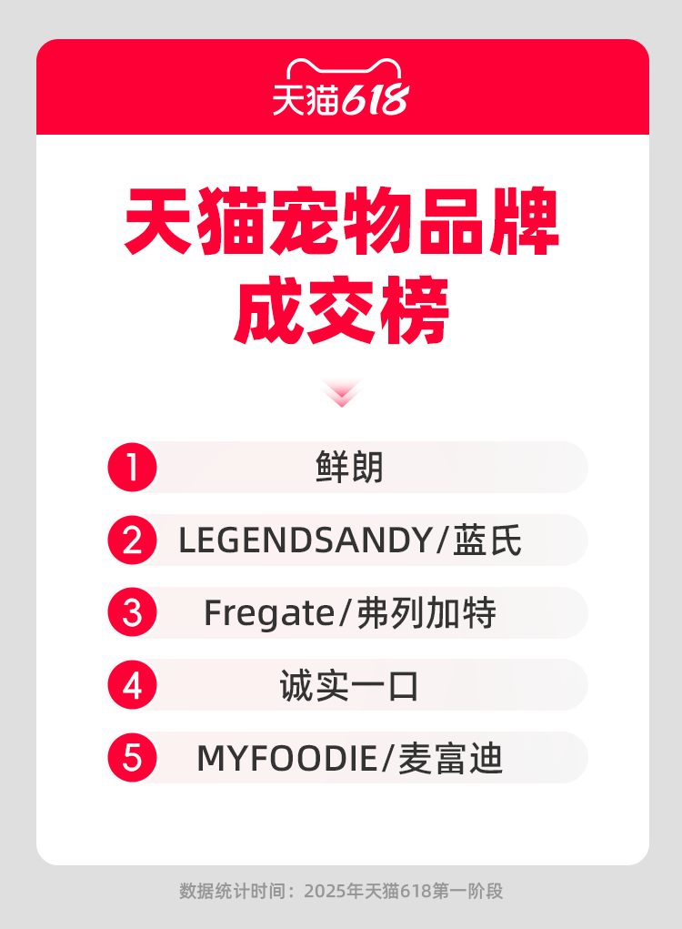 国产品牌的逆袭也在天猫618的销售成绩里得到验证。天猫618第一波开卖阶段,鲜朗、蓝氏、弗列加特、诚实一口、麦富迪这五大国产品牌包揽了宠物品牌成交榜前五,而他们无一例外都入选了500强品牌榜。具体到细分品类,鲜朗位列猫主粮品牌第一,低温烘焙粮正是鲜朗的畅销商品;弗列加特摘得猫烘焙粮品类桂冠。