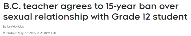 据CTV News报道,加拿大卑诗省(British Columbia)一名教师承认与一名发生性关系后,同意吊销其教师资格证书,并禁止其15年内申请新的教师资格证书。
