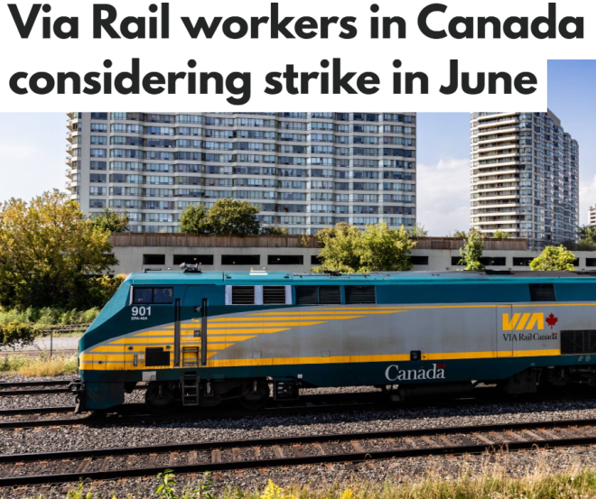 代表超过2,500名维亚铁路工人的工会——Unifor 4000委员会和Local 100分会,于5月26日宣布获得罢工授权。