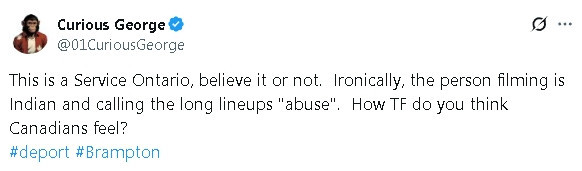 X上发布这段视频的贴主@01CuriousGeorge特别指出,“这是一个Service Ontario,你敢信?讽刺的是,拍视频的人是印度人,还说这排队是‘受罪’(abuse)。那你觉得加拿大人是什么感受?”