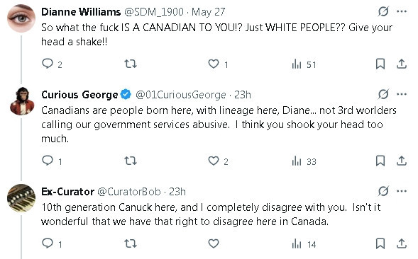 “我在加拿大已经是第十代了,但我完全不同意你的看法。能在加拿大自由表达不同意见,不是很棒吗?”