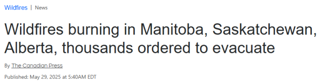 5月29日最新报道,加拿大多个省份正在遭受大范围森林野火的入侵。曼省、萨省、阿省和纽省,均爆发了不同程度的森林野火。