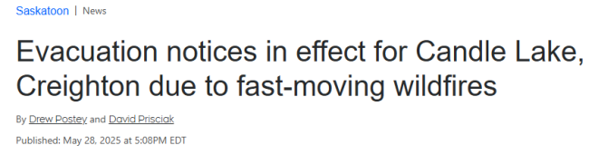 萨斯喀彻温省北部的度假胜地坎德尔湖(Candle Lake)和克雷顿镇(Creighton)已发布疏散警报。