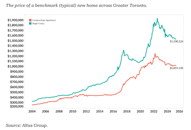 大多伦多地区(GTA)市场持续低迷。根据Altus Group发布的最新数据,2025年4月成为GTA新屋销量有记录以来最差的一个月。库存高企、需求疲软持续对形成下行压力,尽管目前价格仍相对“僵硬”,但在创纪录的低需求下,这种局面可能迅速改变。