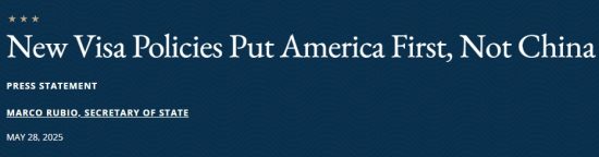 同日,美國國務院網站發布題為“新簽證政策優先考慮美國,而非中國”的聲明,聲稱將“狠狠吊銷”中國學生的簽證,並將修改簽證標準,以加強對來自中國內地和香港的所有未來簽證申請的審查。