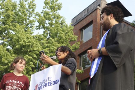 當地時間5月27 日,哈佛大學學生抗議特朗普最近對該校實施的制裁。 美聯社