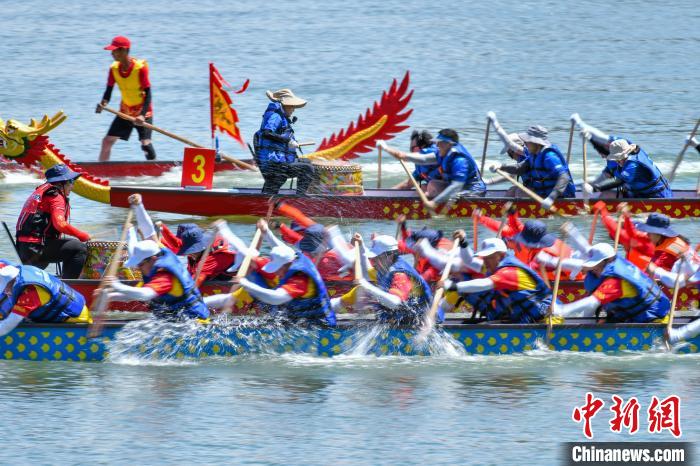 5月31日,正值端午佳节,2025“海口杯”端午国际龙舟邀请赛在海口市海甸溪鸣锣开赛。图为参赛龙舟队在比赛中。记者 骆云飞 摄