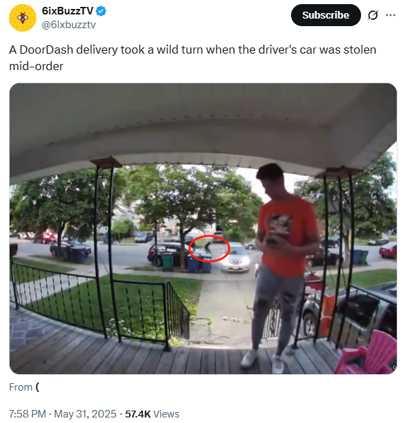 近日,社交媒体X上曝出一段“扎心”视频:一名DoorDash的外卖小哥,在把外卖送至顾客家门口时,有人飞奔冲向他的汽车,溜进驾驶位,当着小哥的面,直接开走了。视频来自多伦多本地媒体6ixBuzzTV。