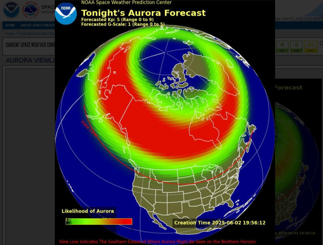 此外,NOAA也表示,明天周二的晚上仍有极光活动,但可见范围将有所缩小。
