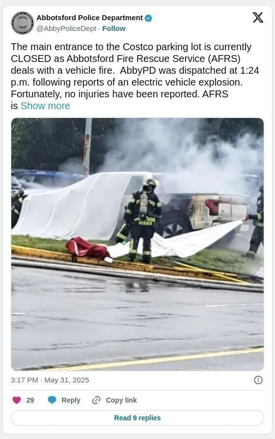 据警方称,在接到电动汽车爆炸的报告后,阿伯茨福德消防救援队 (AFRS) 于下午 1:30 赶往位于苏马斯路 1127 号的Costco停车场。
