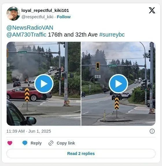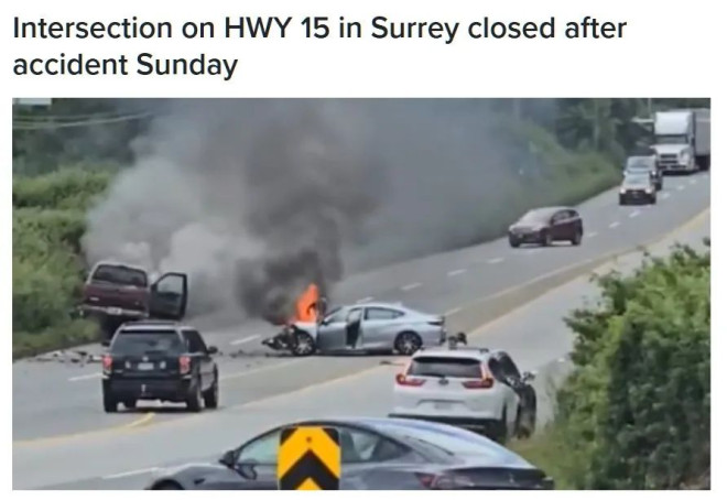 素里警察局警长林赛·霍顿 (Lindsey Houghton) 说,上午 11:30 左右警方接到报警,救援人员赶到现场时,发现其中一辆车已着火。霍顿表示,素里消防局已将火焰扑灭。