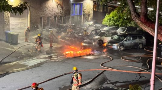 【時報訊】六月三日週二凌晨滿地可北區一商店的停車場發生火災,至少十輛汽車受損。滿市警方於凌晨2點接到911報警電話,報稱在Industriel)和Lacordaire大道交界處處有一輛車起火。