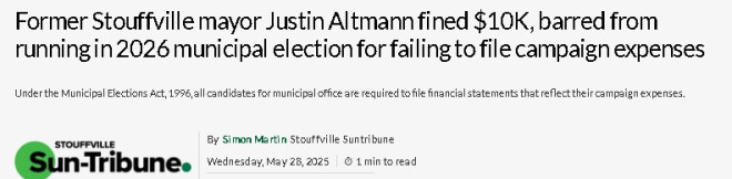 Stouffville镇的前市长贾斯汀·奥特曼(Justin Altmann)因未提交2022年市选的竞选财务报表,已被法庭判罚,并被取消参加下一届市选的资格。