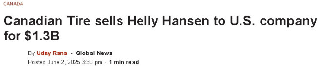 加拿大轮胎公司(Canadian Tire)周一发表声明,表示:“公司已成功完成将Helly Hansen业务出售给美国公司Kontoor Brands, Inc. 的交易。”