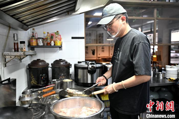 图为陈骏凯正在店内厨房制作菜品。中新网记者 吕明 摄