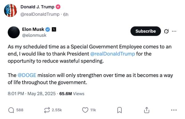 目前特朗普本人尚未公开回应。但在同一天,特朗普在其“真实社交”平台上转发了一张马斯克发布的帖文截图,内容为马斯克感谢特朗普让他领导“政府效率部”。