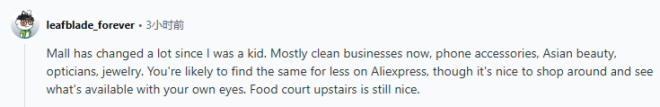 “与我小时候相比,商场发生了很大变化。现在大部分都是干净的商家,手机配件店、亚洲美妆店、眼镜店、珠宝店。虽然在Aliexpress上可以花更少的钱买到同样的东西,但逛逛并亲眼看看有什么好东西还是不错的。楼上的美食广场也很不错。”