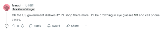 “美国政府不喜欢这家商场?那我更要多去逛逛了。我就爱被眼镜和手机壳淹没。”