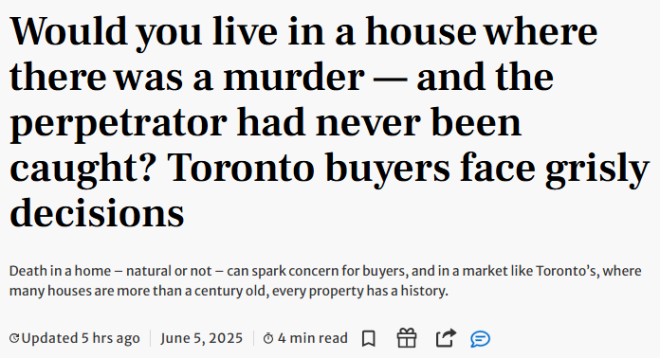 在多伦多这样一个百年老屋遍地的市场里,每处都有历史。但一旦牵涉到死亡(无论是自然死亡还是他杀),无疑都会让不少买家退缩。如果案件未破,甚至凶手仍未落网,这种担忧还会加剧。