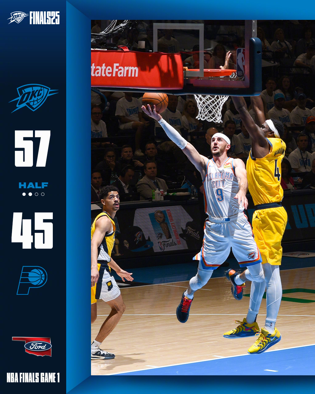 对于这两支年轻队伍而言,总决赛是“陌生”的舞台,雷霆主场的热烈氛围让步行者队打得更加束手束脚。仅上半场,步行者全队失误就达19次之多,好在球队在转换防守方面做得不错,没有因此丢掉太多分数,半场结束时“只”落后12分。