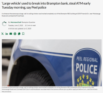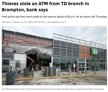 據CBC報道,就在昨天凌晨,賓頓市一家TD銀行的自動提款機(ATM)被挖走。銀行表示該事件是使用一台挖掘機實施的,警方已介入調查。