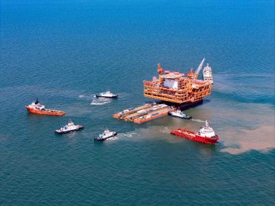 本次安裝的中心處理平台是一座集生產、生活為一體的3層8腿多功能海洋平台,高度22.8米,投影面積相當於近15個標準籃球場大小,設計重量超2萬噸,是渤海海域重量最重、外形尺寸最大的海上油氣平台,超過了國內海上浮吊的能力極限,采用浮托技術進行海上安裝。