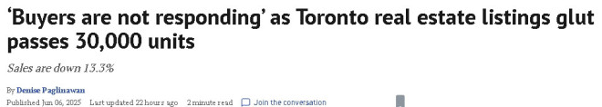 多伦多地区房地产局(TRREB)上周的数据显示,5月活跃房源数量达到3万套,同比大增 41.5%,而销售量则下降了13.3%。