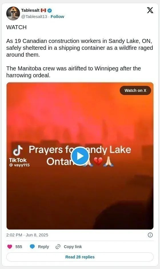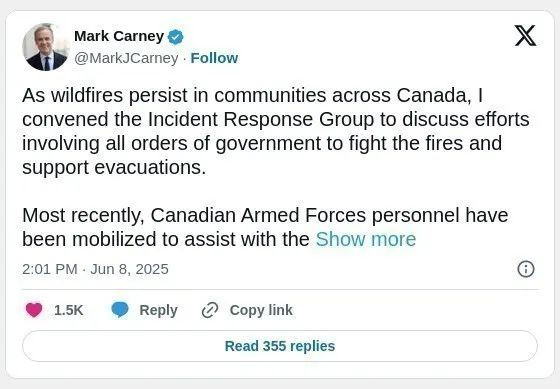 加拿大总理马克.卡尼在社交媒体表示:“由于野火在加拿大各地社区持续发生,我召集了事件响应小组,讨论政府各部门为扑灭火灾和支持撤离所做的努力”。