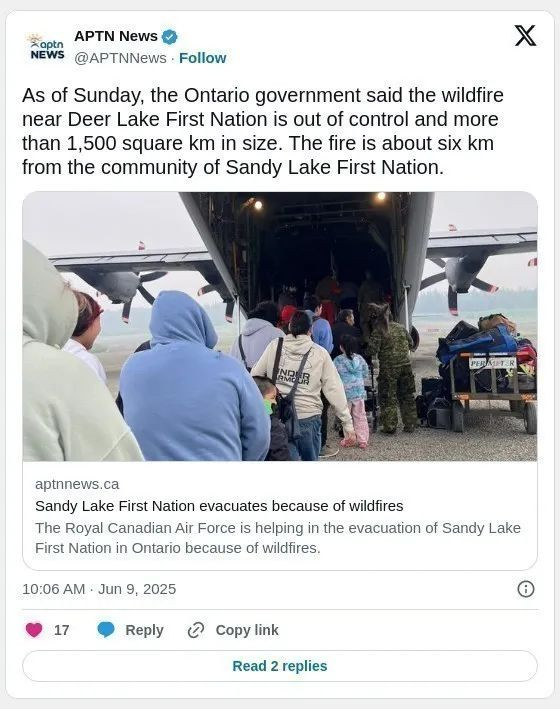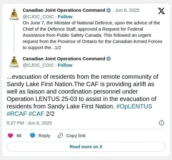 加拿大武装部队在社交媒体表示:“正在根据“LENTUS 25-03”行动提供空运以及联络和协调人员,以协助疏散桑迪湖原住民社区的居民”。