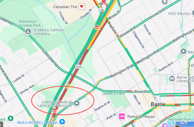 安省交通部称,400号高速公路南行方向在 Duckworth 街与 Bayfield 街之间全线封闭。