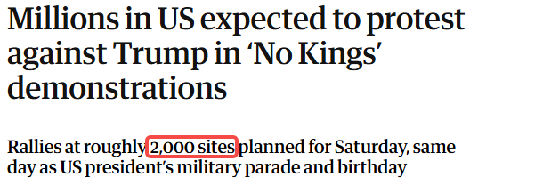 本周六(6月14日),全美50个州、2,000个城市和地区将举行大规模抗议活动,预计数百万人将参加这场名为“No Kings”(无国王)的反特朗普政府示威活动。