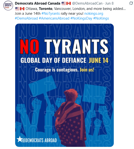 这场浩浩荡荡的示威活动不仅限于美国,全球多个城市也在举行声援行动。加拿大渥太华、多伦多、温哥华、伦敦等地也将在周六举行“No Tyrants”(无暴君)示威活动。