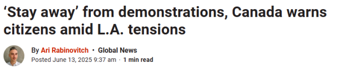 在这一背景下,加拿大政府近日对在美国的公民发出了警告,提醒他们“远离”洛杉矶及其他主要城市的示威活动,以保障自身的安全。