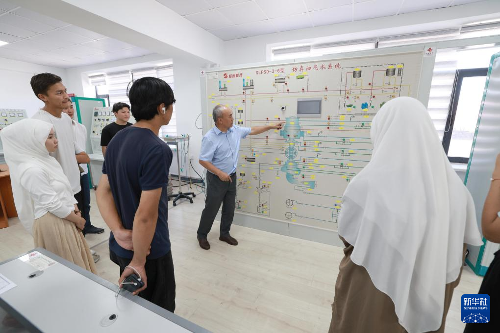 6月4日,在吉尔吉斯斯坦首都比什凯克,吉尔吉斯斯坦鲁班工坊负责人阿克尔别克・奇梅罗夫(后中)在鲁班工坊电力系统综合自动化实验室向学生讲解仿真油气水系统。新华社发(罗曼摄)