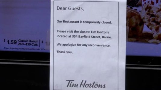 6月13日,CTV News 拍到 Livingstone Street 的 Tim Hortons 已張貼暫停營業告示。