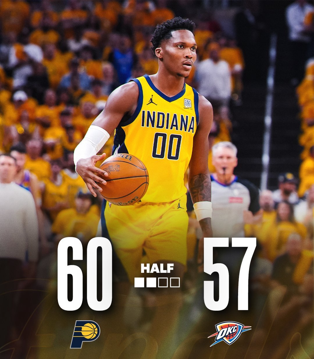 第二节比赛,亚历山大用标志性的中投帮助雷霆队紧咬比分。此后,步行者队进攻陷入停滞,雷霆队抓住机会不断杀伤篮下将比分反超。西亚卡姆空切得手,哈利伯顿找回状态上篮打成2+1连砍5分。半场战罢,步行者队60:57领先。